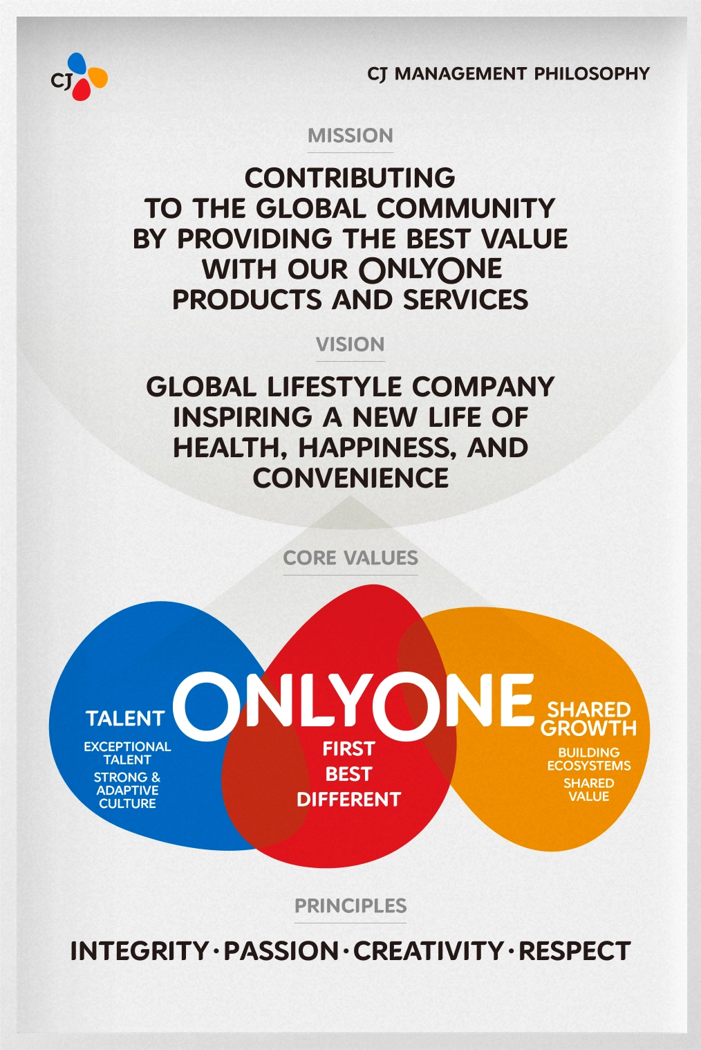 Ever since starting Korea’s very first sugar manufacturer during the time of postwar reconstruction in 1953, CJ continuously practiced·evolved our founder’s vision of “contributing to the national economy (business patriotism).” We industrialized new markets by diving into futuristic businesses that met the challenges of this era. We walked the path of creation by sharing growth with markets and enterprises. Based on our core values ONLYONE, Exceptional Talent, and Shared Growth, we provided the best values to our stakeholders We secured our position as a reputed global lifestyle company by taking the lead in spreading our cultural values to a wider world.