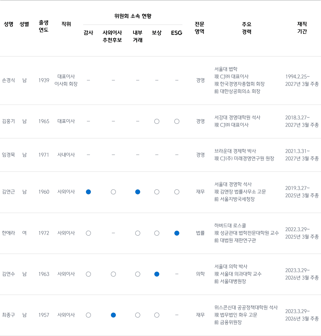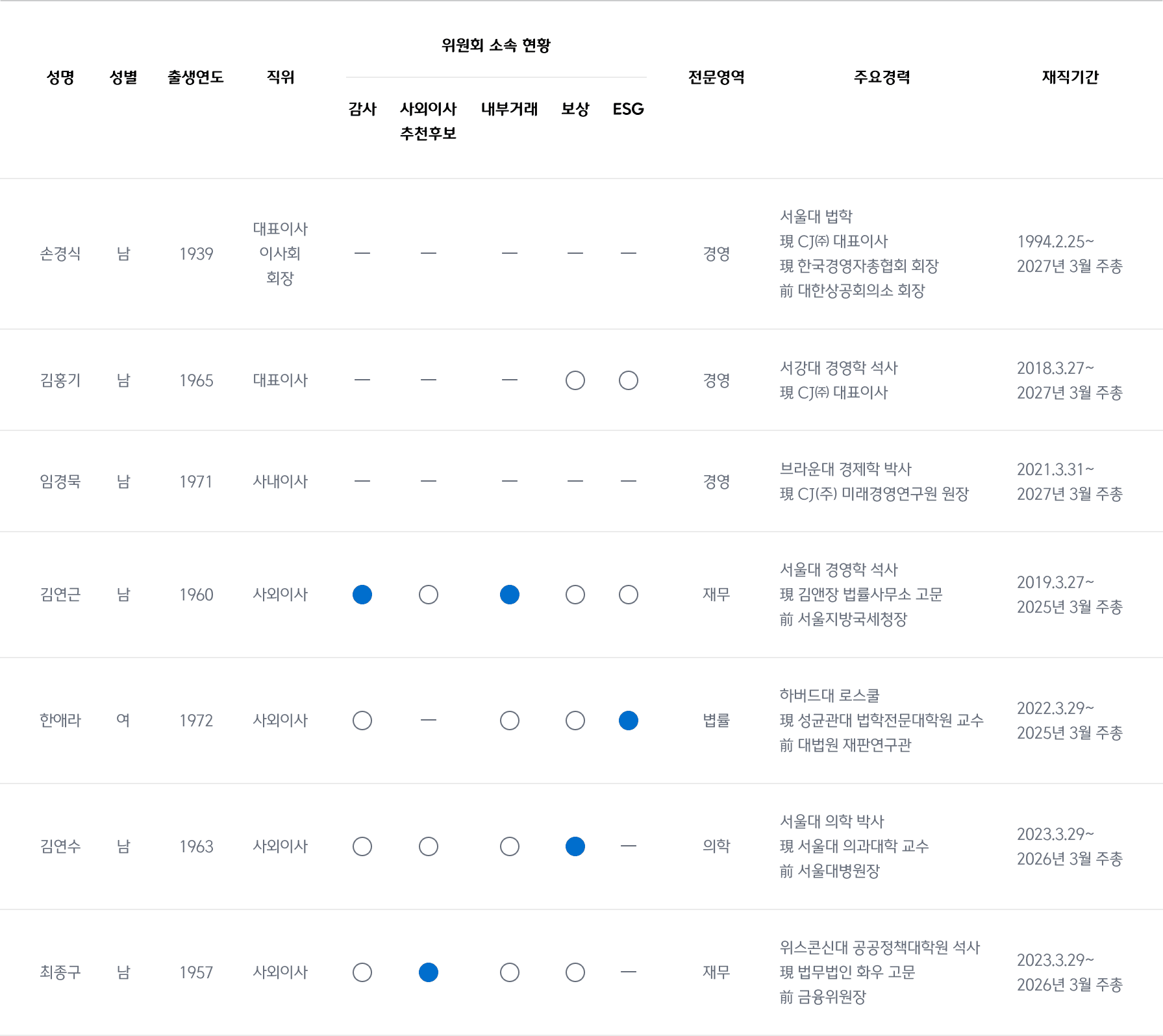 | 손경식 | 남 | 1939 | 대표이사 이사회 회장 | 경영 | 서울대 법학 現 한국경영자총협회 회장 現 CJ㈜ 대표이사 前 대한상공회의소 | 1994.02.25~ 2027년 3월 주총 | |||||