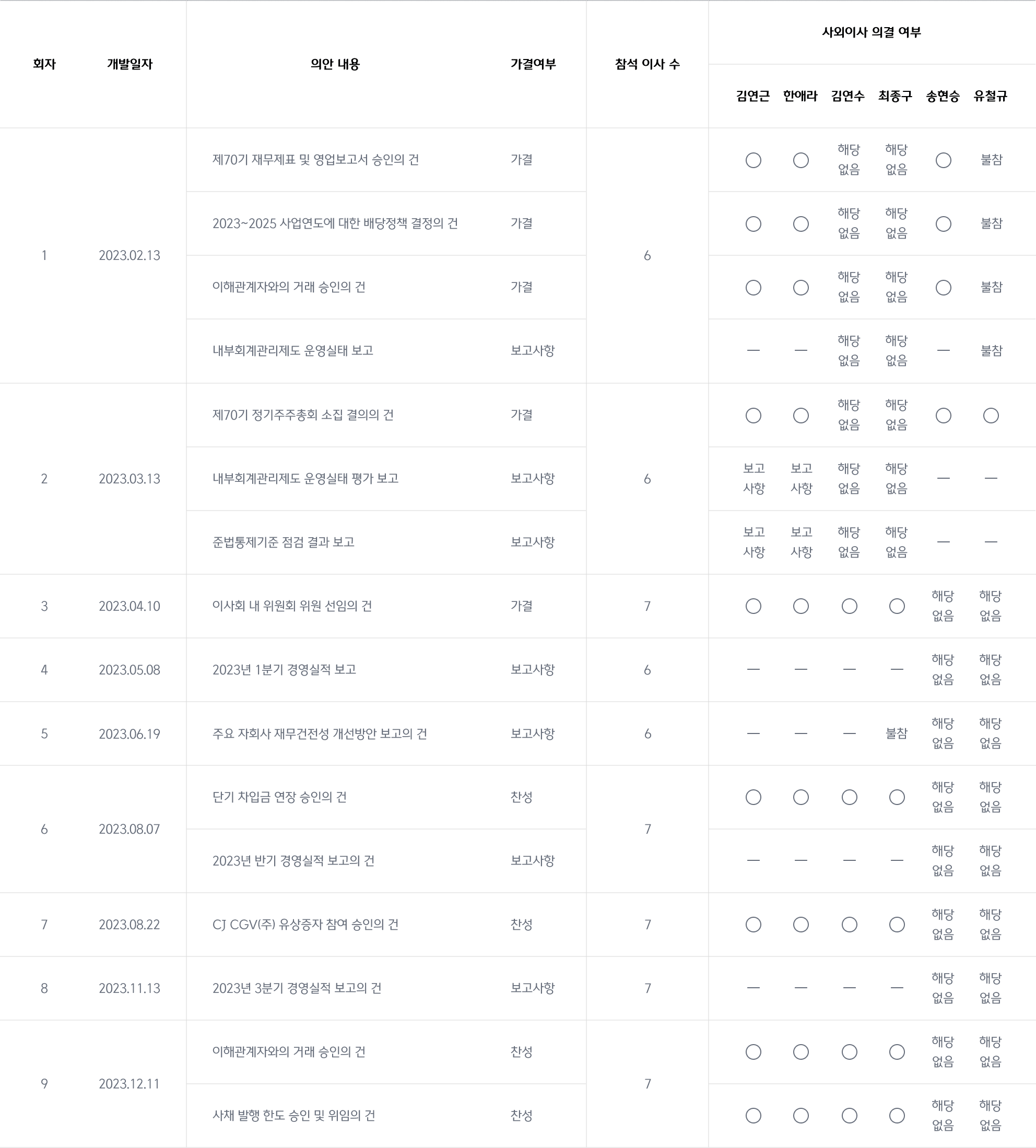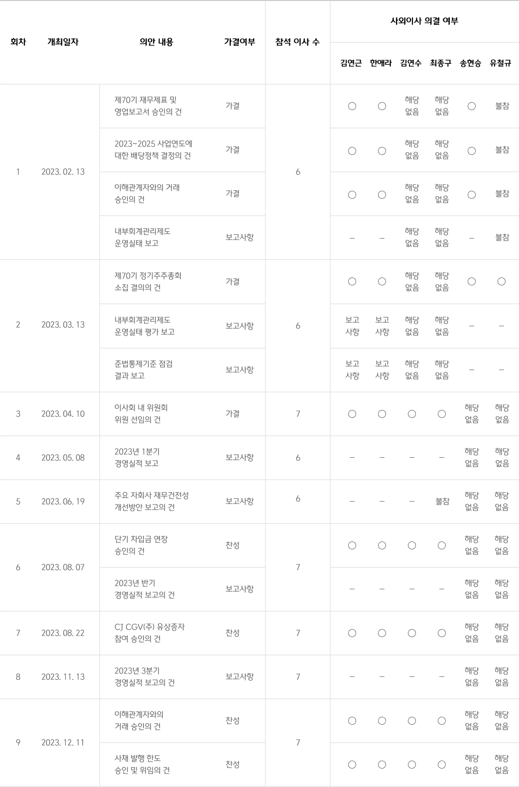 | 7 | 2023. 08. 22 | CJ CGV(주) 유상증자 참여 승인의 건 | 찬성 | 7 | 해당 없음 | 해당 없음 | ||||