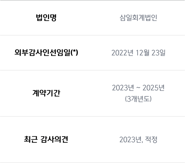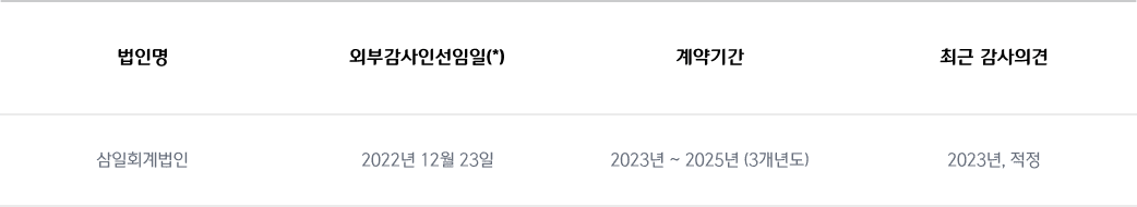 | 삼일회계법인 | 2022년 12월 23일 | 2023년 ~ 2025년 (3개년도) | 2023년, 적정 |