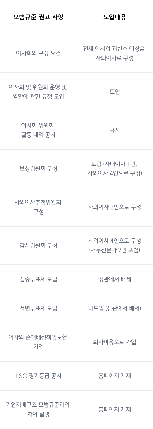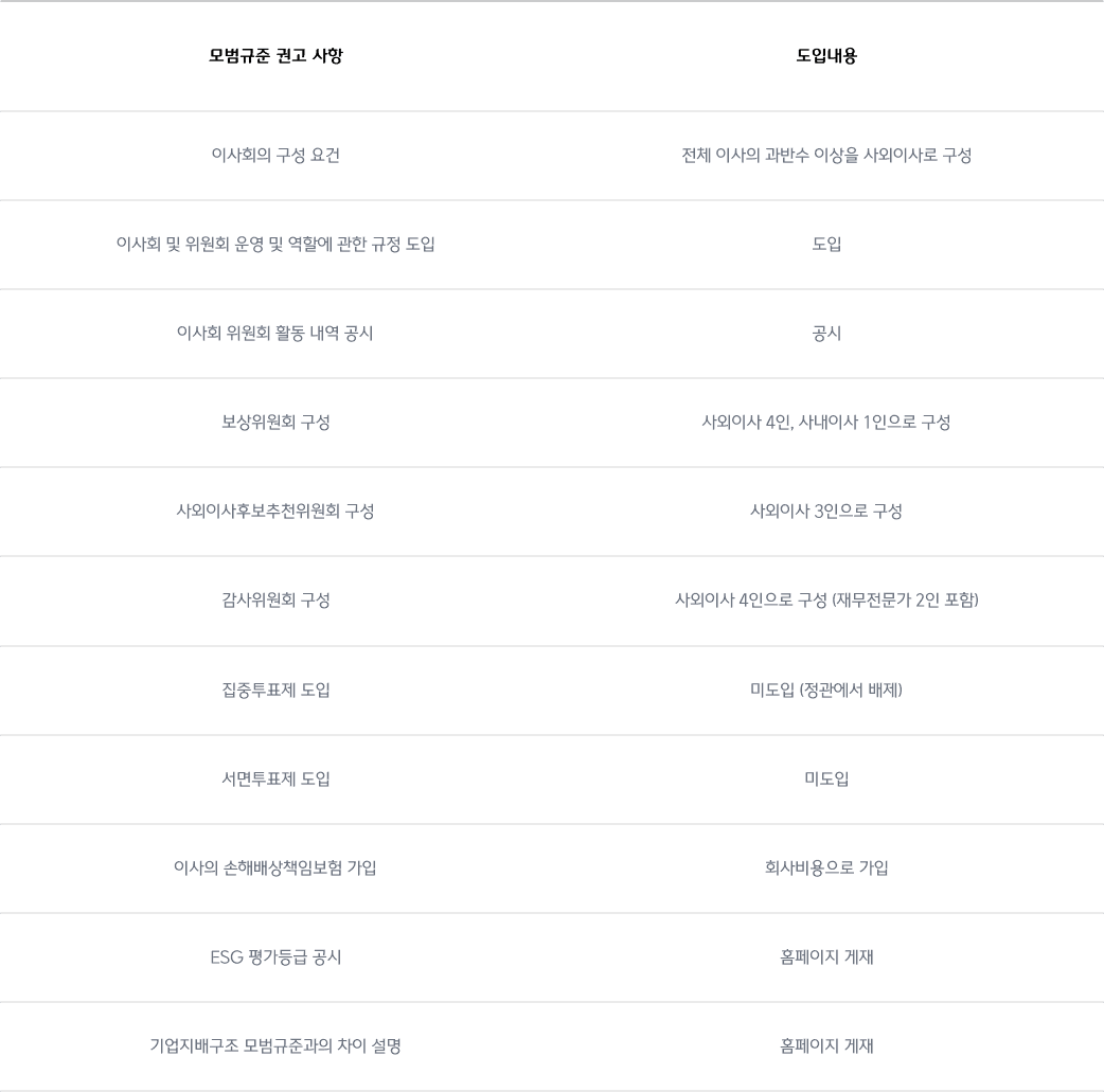 | 이사회 및 위원회 운영 및 역할에 관한 규정 도입 | 도입 |
