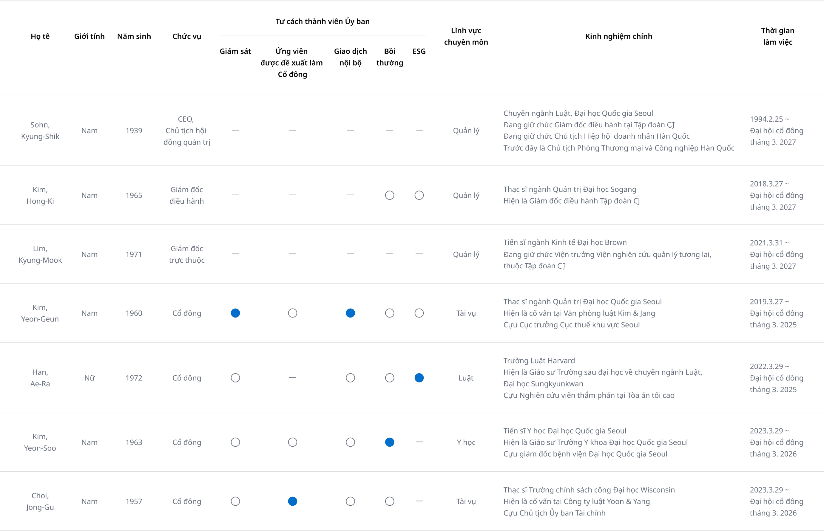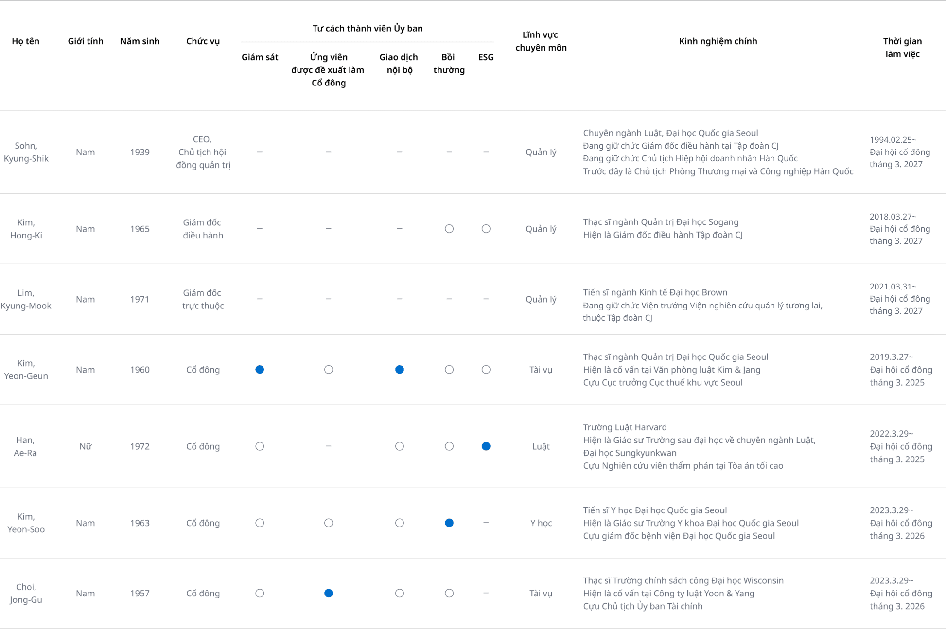 | Sohn, Kyung-Shik | Nam | 1939 | CEO, Chủ tịch hội đồng quản trị | Quản lý | Ngành Luật, Đại học Quốc gia Seoul Hiện hành Chủ tịch Liên đoàn người sử dụng lao động Hàn Quốc Hiện hành Giám đốc điều hành Tập đoàn CJ Trước đây là Chủ tịch Phòng Thương mại và Công nghiệp Hàn Quốc | 1994.2.25~ Đại hội cổ đông tháng 3. 2024 | |||||