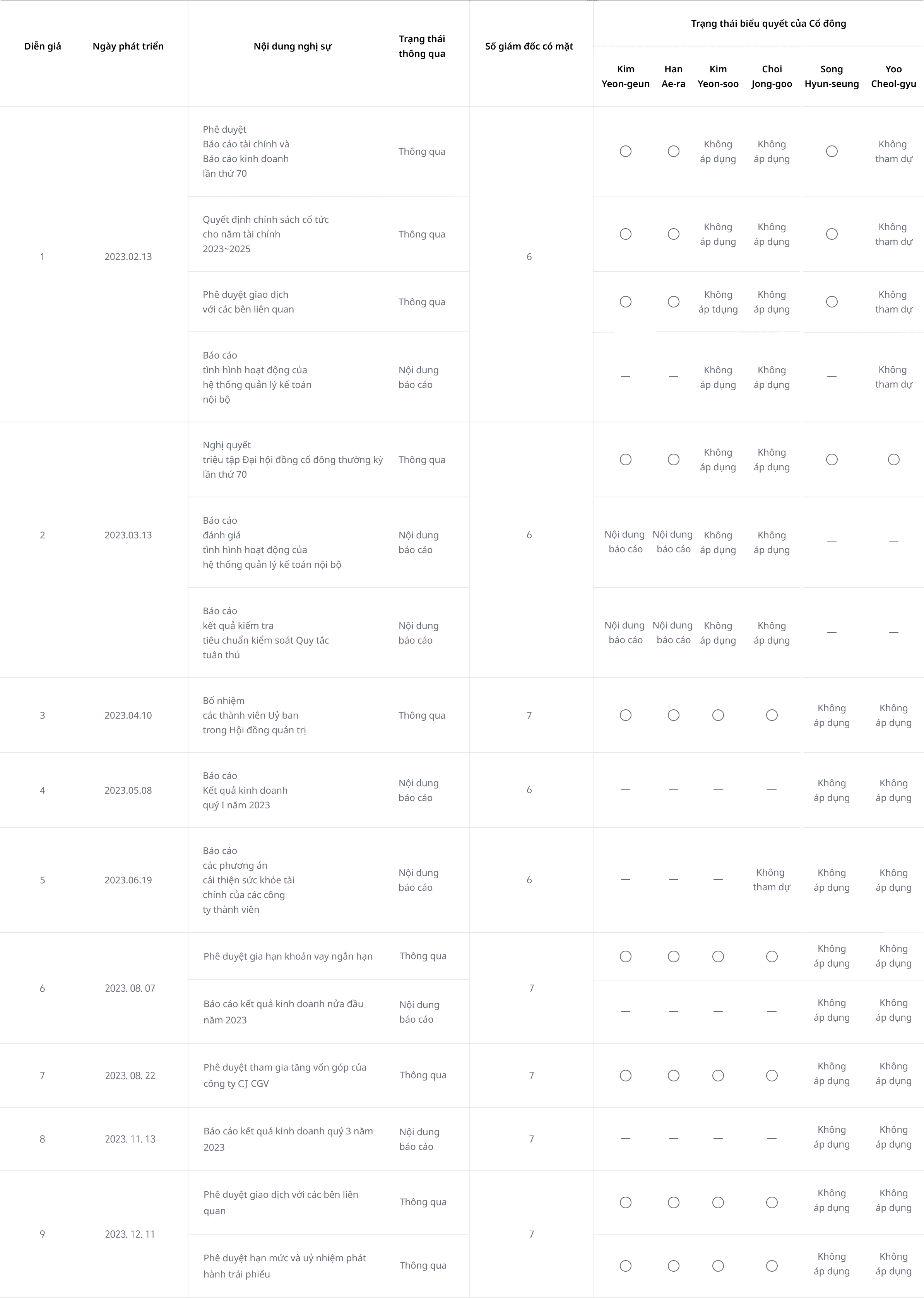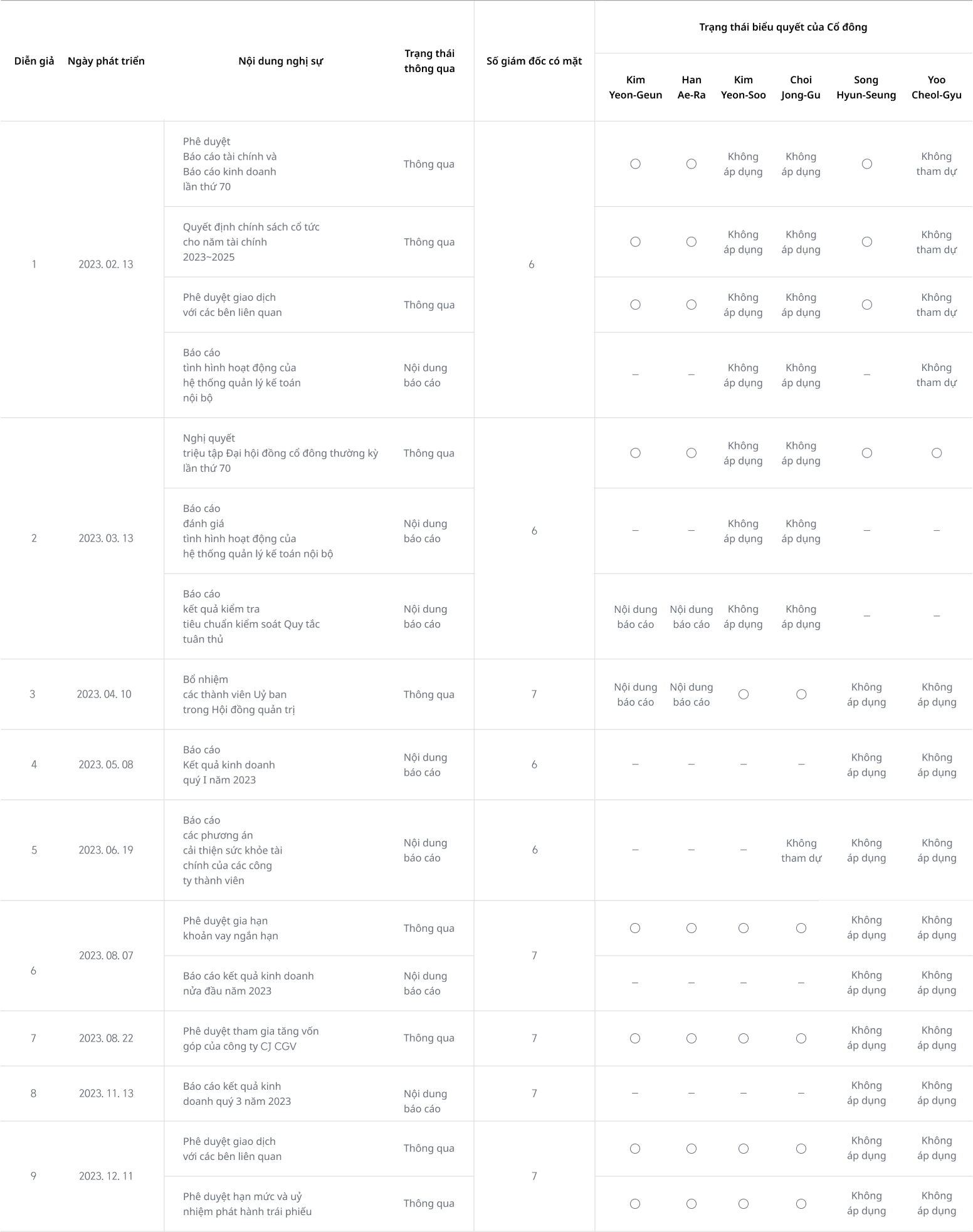 | 1 | 2023. 02. 13 | Phê duyệt Báo cáo tài chính và Báo cáo kinh doanh lần thứ 70 | Thông qua | 6 | Không áp dụng | Không áp dụng | ||||