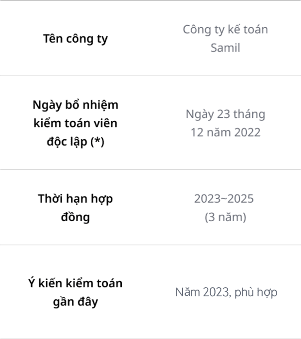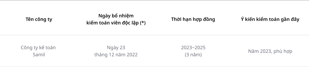 | Công ty kế toán Samil | Ngày 23 tháng 12 năm 2022 | 2023~2025 (3 năm) | Năm 2022, công ty kế toán Hanyoung |