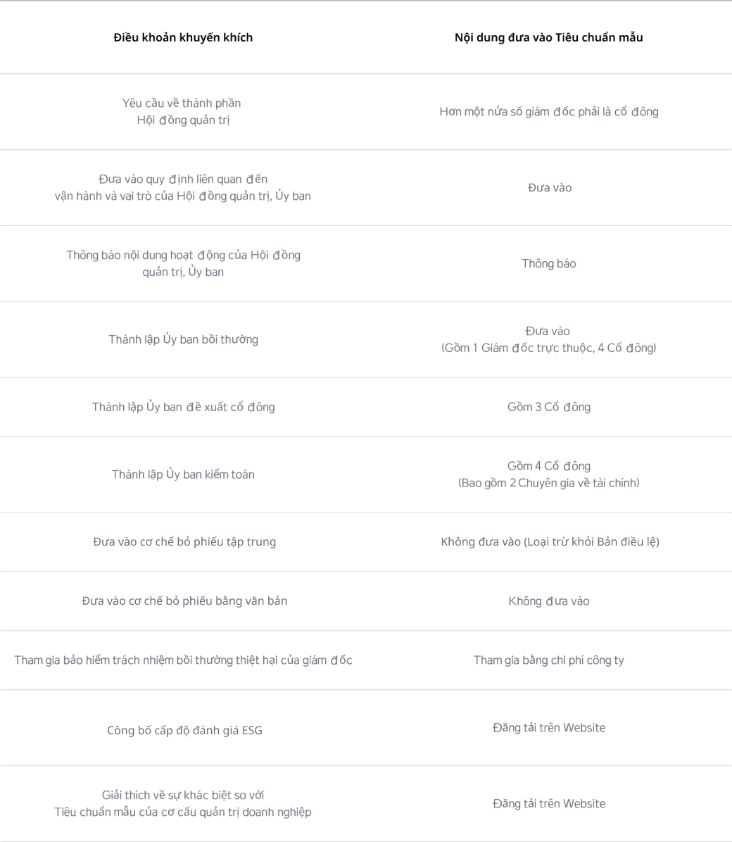| Giải thích về sự khác biệt so với Tiêu chuẩn mẫu của cơ cấu quản trị doanh nghiệp | Đăng tải trên Website |