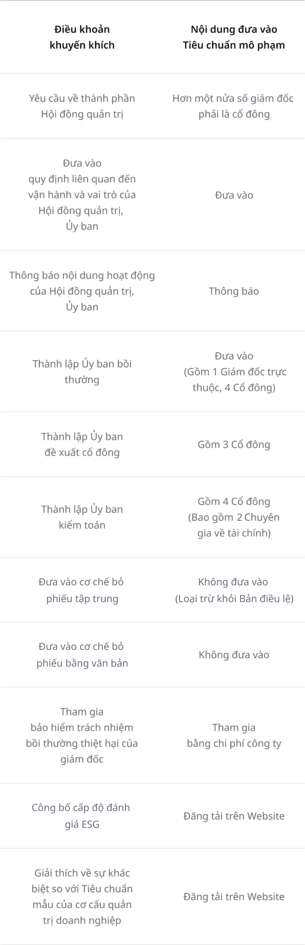 | Đưa vào quy định liên quan đến vận hành và vai trò của Hội đồng quản trị, Ủy ban | Đưa vào |